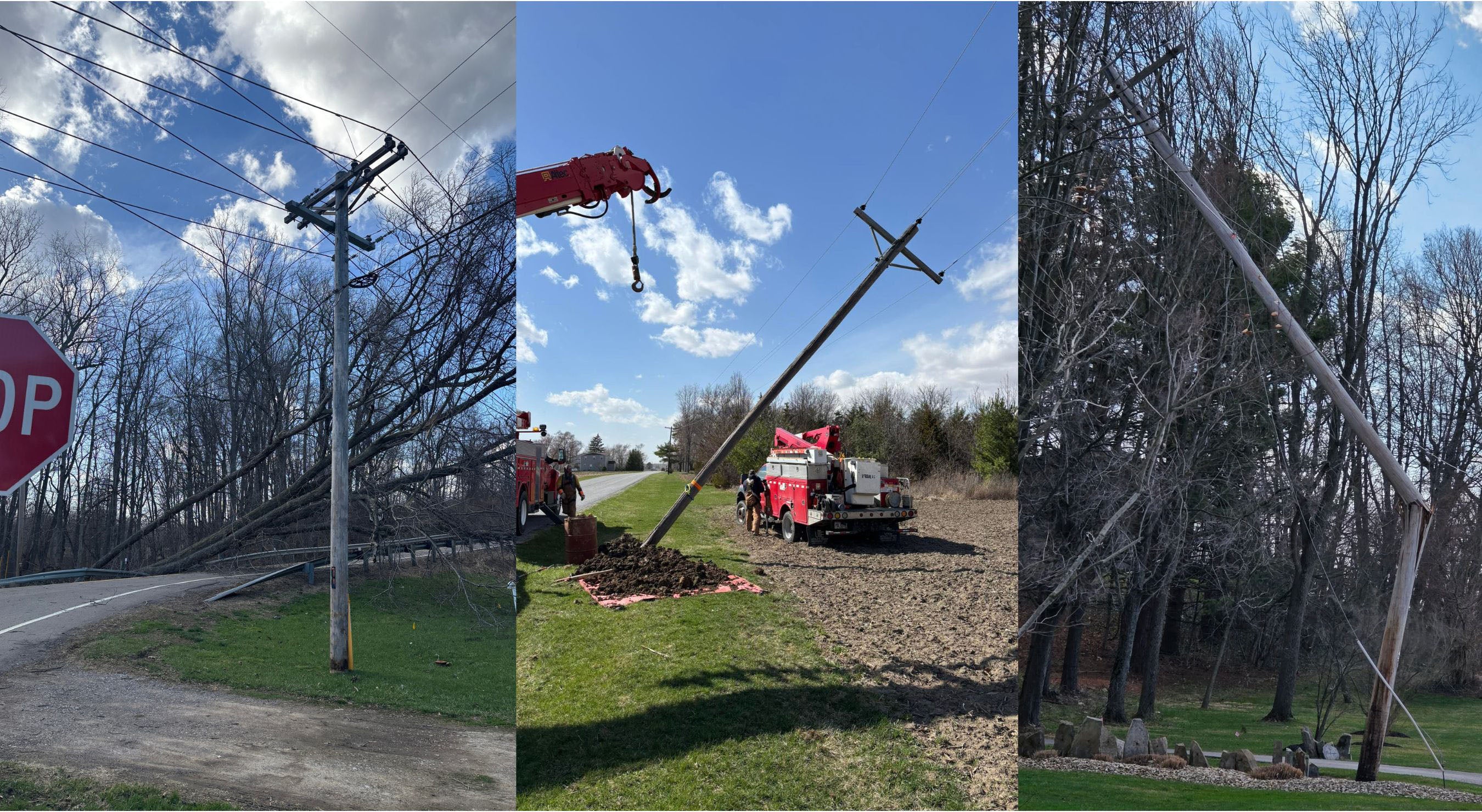 Snapped utility poles and substations without power from transmission suppliers caused many of the outages across the central part of the state. Pictured above from left to right are damage photos from Holmes-Wayne Electric Cooperative, Midwest Electric and Firelands Electric Cooperative.